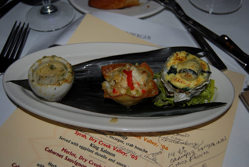 Seafood Trilogy: Escargo, Crab Bouche and Oysters Rockefeller. Served with a wonderful 2006 “La Brume”, Dry Creek Valley Chardonnay.