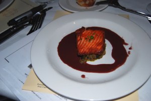 King Salmon with Eggplant Duxelle and Sauce Meurette. Served with an awesome 2005 Dry Creek Valley Syrah.
