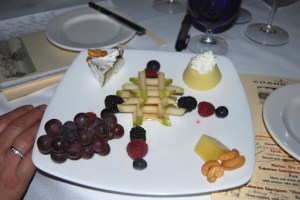Cheese Plate garnished with Chocolate Ganache and served with Belle de Brillet “Poire au Cognac” that was awesome.
