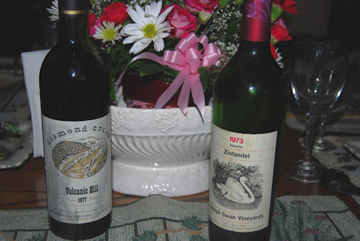 And some of the wine. A 1977 Diamond Creek, Volcanic Hill Cabernet Sauvignon, on the left. And on the right, a 1973 Joseph Swan Vineyards Zinfandel. Both of these wines from our cellar.
