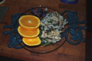 First of all, we had some left-overs (Anthropologically – Hunters and Gathers) so Robin made a very good dish. Pictured above is Halibut with Beurre Blanc and Rice with Almonds and String Beans. A good wine went well with this – a 2006 Casa Castillo Jumilla.
