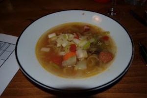 For starters, we had this delicious Portuguese Stone Soup. I have no idea where the name came from, but I didn’t find any stones. (I bet they cooked the soup with hot stones.) This soup is full of onion, sweet red peppers, leek, green beans, Chorizo, potatoes, carrot and red beans. This is a light soup that went very well with a 2007 Caves da Cerca Vino Verde ($10.00 and 9.5%) and a 2007 Coto de Hayas Campo de Borja Crianza ($12.00). These two wines were pretty good alone, but as most wines go, they were far better with the food. Both were clean and light on the nose and refreshing on the palate.