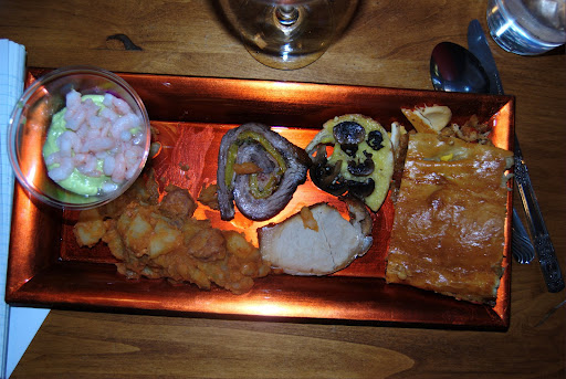 The “Star of the Tasting”, so far as the food went, was this plate. Shrimp Cocktail in Avocado Cream (awesome!!!), Potatoes, Beef, Pork, Bread with Black Olives and a pastry filled with mushrooms and vegetables. The wines were a 2006 Mad Dogs and Englishmen ($13.00, 13.5%) and a 2003 Emina, ($15.00, 13.5%). These two wines were the Show Stoppers for the evening. The paring with the Tapas platter was awesome.