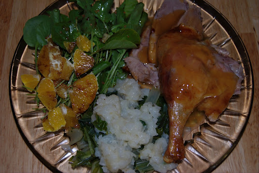 So, what’s for dinner on a rainy, muggy Boise, Idaho Sunday afternoon? Not your conventional “Old Peoples” dinner – Chicken Mashed Potatoes and Gravy and Peas. Nope! None of that. Try a great Duck l’Orange with Smashed Turnips on a bed of Greens and a Watercress and Orange Salad with a Balsamic Dressing. Ahhhh! So good! Cheers!