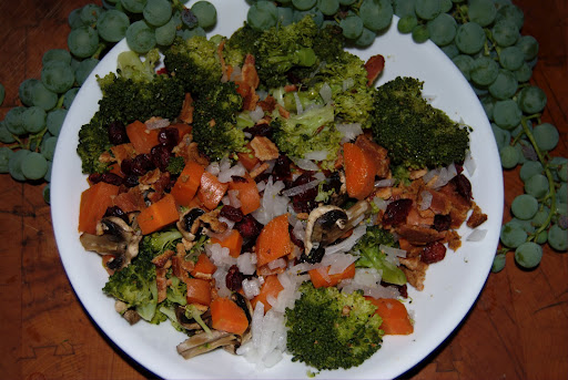 Optional- raisins, sunflower seeds, nutsBlanch the broccoli and set aside to cool. Boil the carrots in salt and pepper and brown sugar until tender. Set aside to cool. Sauté the mushrooms until golden brown. Set aside to cool.