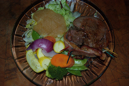done by our friends to the west, I went to our local butcher and had him cut me two nice, fresh Filet Mignon steaks, about 1″ thick. Nice! Then I found some pretty good fresh vegetables – summer squash, Chinese peas, broccoli, carrots and onion. Just a simple matter of cutting the veggies into pieces and steaming them over a bath of Herbs de Provence (our own blend) and salt and pepper until tender. The beef was bacon wrapped and grilled over low heat on the stove. A simple salad of shredded lettuce and applesauce. It has been rainy and somewhat cool here in Boise today – a little gloomy. So this dinner seemed to be a “comfort” meal that drove the blahs away. If nothing else, the plate tends to have some nice color in it that aids in the presentation. We eat with our eyes first. It was fun to make. Cheers!