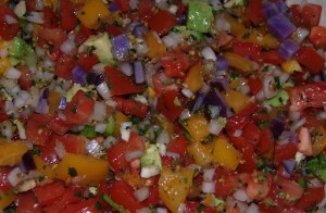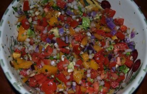 Ah yes! The infamous weekend arrives. The traditional in-state rivalry between the Boise State Broncos and the University of Idaho Vandals. Too bad the ESPN major stations don’t want to carry it and most of the 60000 fans (combined total of BSU and U of I fans) here in Idaho will be shut out of watching the game. So we made the Pico de Gallo BSU Style to devour during the game, as the Broncos will do to the Vandals. (Yes, we were lucky enough to know someone who has ESPNU) Do you see the Blue and Orange in the Pico de Gallo? There’s a lot of it all through the dish.