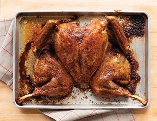 2. Rinse inside and outside of turkey; pat dry with paper towels. Spatchcock turkey*. Transfer to a rimmed baking sheet, breast side up. Let stand for 30 minutes.