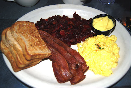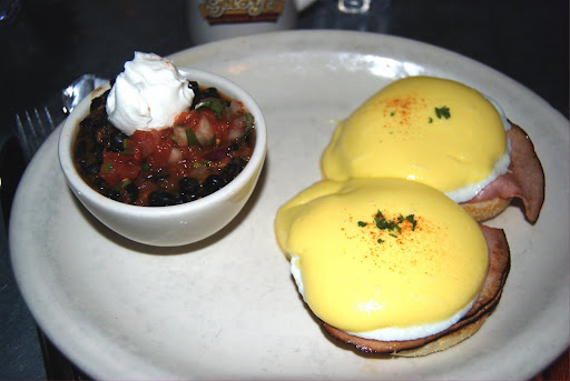 An awesome breakfast. Top Row – Left to Right: Standard Breakfast, Scrambled Eggs, Red Hash browns and Toast; Eggs Benedict with Black Beans.