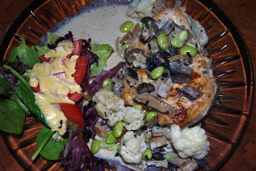 Brasied Chicken Breasts with Steamed Cauliflower and Edamame in Portobello Reduced Bisque