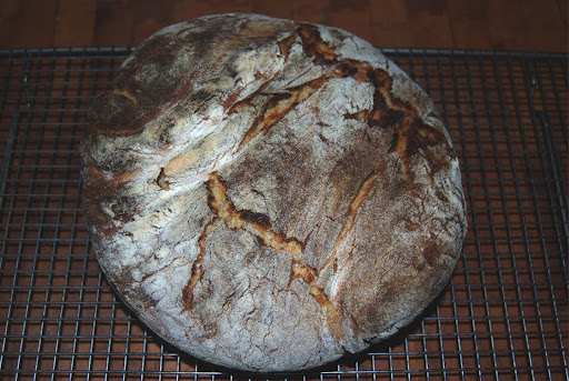 This is a version of Zorba’s No-Knead Bread. At step #2, I added 1 1/2 cups of sourdough starter. Follow the link to the full recipe. It is not difficult.