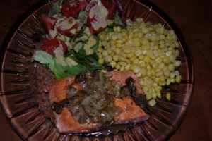The salmon pictured is sauteed and then a reduction of shallot and tarragon in Marsala. Plate with a nice green salad and corn. Pair the dinner with a good 2005 Vickers Vineyard Chardonnay and you have a good dinner. It is not really that hard to make and probably would work with a Halibut steak or maybe a nice fillet of Flounder.