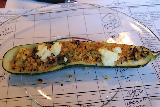 And with the Stuffed Zucchini, we had a good 2005 Mezzacorona Moscato, 11.5% (17). A dry and still wine that really goes well with the light spicyness and herby stuffing of the zucchini. Yet, the zucchini, usually a very mild squash, was not overpowered by the Moscato.