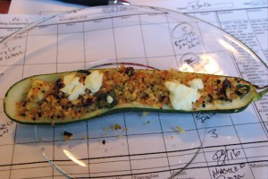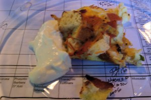 (Sorry for the lousy photo!) We started with a 2004 Villa Felici Classico Orvieto, 12% (17). This was a grassy, vanilla and sea shore nose. This would age another 4 years or so. Then we had a 2006 Masked Rider Syrah, 13.5% (16). A very light red that is easy to drink. Both of these wines were the preliminary wines. Then with the Wine and Cheese Strata, we had a wonderful NV Risata Moscato D’Asti, 5.5% (19). Very drinkable and clean. A wonderful wedding wine. Robin and I both enjoyed this blue bottle, wine.