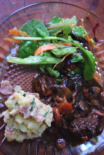 After watching Julie and Julia for the third time; and after watching Julie Powell burn the Bœuf Bourguignon for the third time, I decided to see if I could make this classic Julia Child dish without burning it. Here is a link to the Recipe, albeit altered slightly. And to beat that, we had friends over for dinner! Bœuf Bourguignon, Chive Mashed Potatoes and a great Green Salad. We chose two wonderful wines to go with dinner, 2006 Indian Creek Winery Pinot Noir and a 1989 Montinore Vineyards Pinot Noir. Then for dessert, Robin made a wonderful Chocolate Banana Cake. And on top of all of that, I did not burn the Bœuf Bourguignon! Just a wonderful dinner! Cheers!