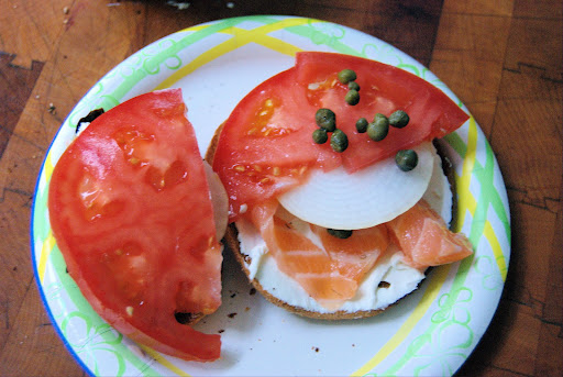 Robin made some fresh lox the other day out of some fresh salmon. So for lunch today, we had a Cream Cheese and Lox with Onion, Capers and Fresh Bibb Lettuce on a Toasted Bun. (Thanks Donna, for the lettuce sets!) Delish!! There is a place in downtown Boise where you can get this for $6.95 and it is called a Manhattan. Their’s is good …. But this is better. It’s fresher, I think. Anyway, it was good!
