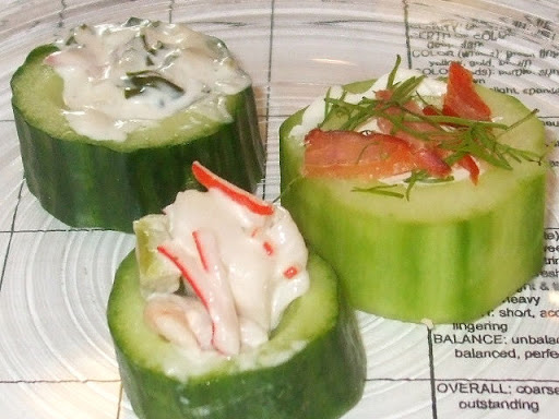 Next on the menu was a delightful and refreshing Cucumber Roulade. This went quite well with the 2004 Martin Sancho Verdejo, 13.5%, $16.00, (18). This light and refreshing wine went very well with the cucumber. Although the alcohol is somewhat high, this wine is not “hot”.