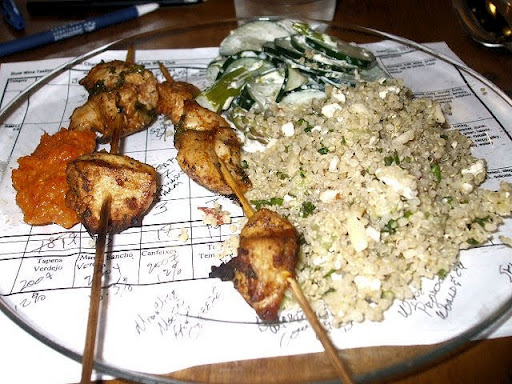 Grilled Chicken Kabobs with Romesco Sauce, Cucumber and Asparagus in Dill and Quinoa. A hardy 2004 Marquez Riscal Tempranillo, 11.5%, $12.00, (19), was the perfect match with this entree.