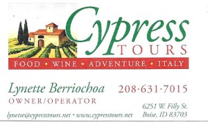 During the summer, there are just so many things to do in Boise. The First Thursday celebrations are no exception. We were looking for a specific art exhibit, but were really disappointed when we found it. So, we had to find a place to eat. We ate at the Cazba, a Mediterranean restaurant – Greek, Egyptian, Lebanon style food. That is where we met Lynette Berriochoa from Cypress Tours, tours of food and wine in Italy.