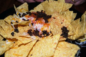 Crab Nachos. A delightful change from your standard nachos. These come with tortilla chips topped with crab, blend of cheeses and black olives. Big enough for two!