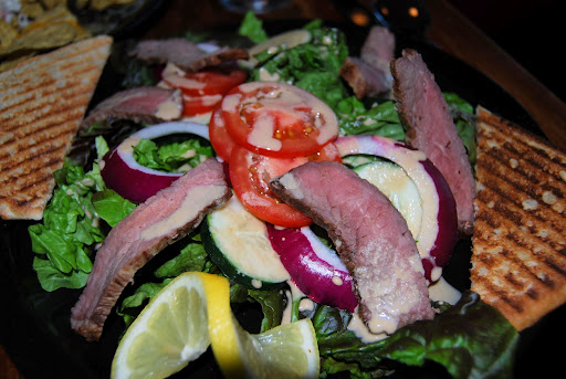 Flat Iron Steak Salad with Thai Dressing. I really liked this. (Robin and I shared each others selections) The steak was done just perfect – slightly pink as you can see. This is served with chopped romaine, red onion, cucumber and tomato tossed in a Thai dressing. This is an excellent salad.