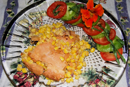 Please note that the corn was local grown, the pie crust is locally produced, the tomato and basil is from our garden. That makes this a Locovore Dinner. Enjoy! And as it has been said before, Keep a song in your heart, Keep looking up and Cheers!