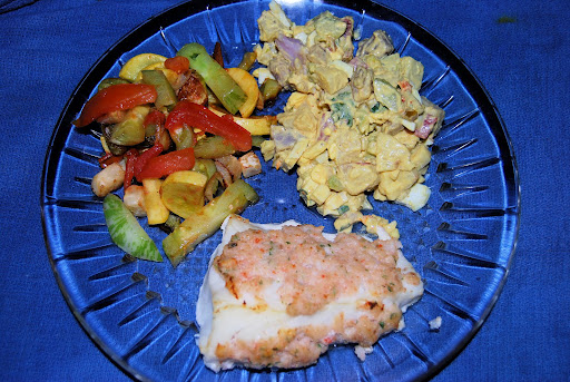 But tonight, we need dinner. I remember a Lobster Stuffed Whitefish from somewhere. No lobster in our refrig. But we have Prawns! And we have Cod! So make a shrimp paste – shrimp, bread crumbs, lemon thyme, cream and salt and pepper. Run through a food processor until in paste form. Cut a pocket in the fish and stuff with the shrimp paste. Bake at 375 degrees F until browned on top. And a fresh and local vegetable saute – tomato, Zebra tomato, summer squash, kohlrabi, leek. Here was the menu: