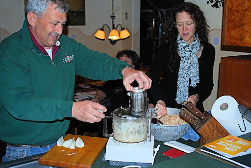 Joe and Rachael are preparing the latke mixture.