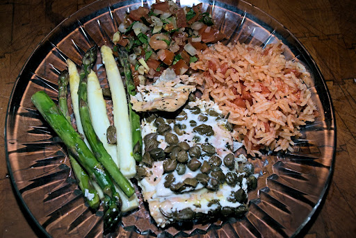 Update: I have had several requests for the salmon recipe. Here is the recipe for Baked Salmon II from Allrecipes. I did not have any parsley, so I used the capers on top. I also steamed the asparagus right in the packets. It is an interesting recipe, but easy to do.