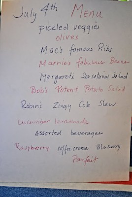 I rode my bike down to the parade and worked up a good appetite. Here is the menu! And below is the dinner. Yum-O!!