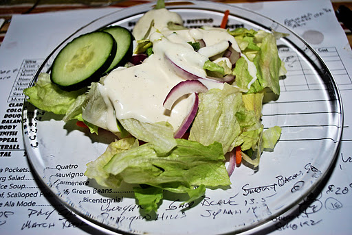 Interesting thing about this wine. Look at the double score! In my opinion, don’t even think of drinking this without food, the [15] score. This wine went superbly with the Ranch Dressing of the salad and the raw onion, the [19] score. Just goes to show you: Drink wine with food!!!
