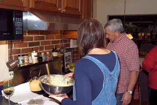The main theme of tonight is the Second Annual Latke Cook-Off! Here is a very basic recipe for Latkes. They are a traditional Hanukkah fare along with sour cream and apple sauce. Usually, too, there is a green salad. So much fun. Thanks to Joe and Rachael Levitch for opening their home and kitchen for this event. And thanks also to Jodi Peterson for agreeing to challenge Joe to the cook-off.