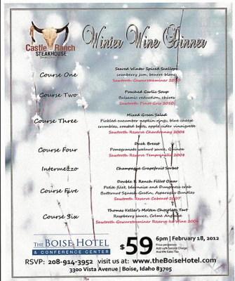 Don’t forget the Winter Wine Dinner at the Boise Hotel in the Castle Ranch Steakhouse on Vista Ave on February 18, 2012. Sawtooth Winery will be featured and the dinner looks awesome! Calling for reservations is strongly suggested. This will be an exciting evening. See you there!! Left-Click the graphic to get a printable copy and a larger view.
