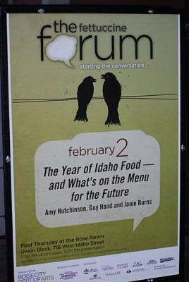 Robin and I attend several “conferences” each year on different subjects. One of my favorites, and I think Robin’s too, is the Year of Idaho Food and in this case, the Fettuccine Forum. The bottom line of tonight’s program is to eat local; buy local; support the local farmers. All of the speakers on the program, invited the audience to Think Local. They reminded everyone that we do indeed have space for our own garden. Yes, even in an apartment. There are a variety of containers that can be used to plant tomatoes, carrots, herbs or a host of other vegetables. We were encouraged to use our imagination.