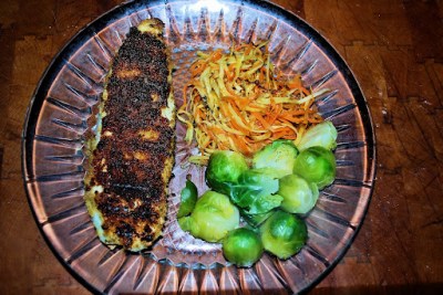 I know, some of you do not like talapia, a white fish. Very mild. But look at how we prepared it and what we served it with. The sake goes very well with the talapia and the Brussels sprouts. Sorry but the tartar sauce and the sake are not pictured.