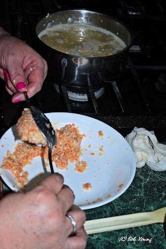 Yup! That’s Robin making the gefilte fish … from scratch. You can purchase them already prepared, but these are so much better.