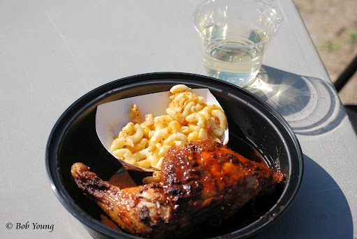 BBQ Chicken and Mac and Cheese from Brown Shuga. This chicken was delicious. I like it better than the turkey legs. That surprised Yvonne. The wine is from the Indian Creek Winery and was a viognier. It went very well with the BBQ.