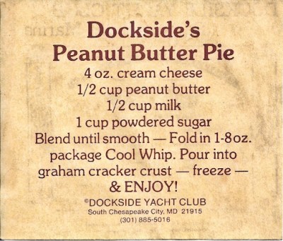 This is an awesome peanut butter pie and so very easy to make. No cooking. Just mix it together, place in the freezer and wait – if you can – until it sets up. This is the original recipe from the Dockside Yacht Club in South Chesapeake City, Maryland. You can either go full screen and save the graphic below, or see the recipe by Clicking Here. There is also a copy in the Master Recipe List on this blog. (See above) The graphics displayed here are the original copies of the recipe handed out by the Dockside Yacht Club. I don’t know if you can still get them. The recipe as scanned here is at least 30 years old. I scanned these from the original. Enjoy!