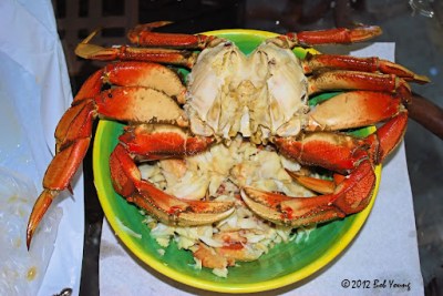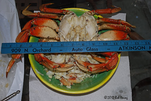 Robin and I bought 14 Dungeness crabs at about 1.75 lbs each. 7 of us ate them. And at the end of the evening, we could take some home. Beer and wine accompanied the crabs quite well. Margaret brought her delicious potato salad, and Marnie and Mac bought corn, which Mac grilled. Sophia made a raspberry cake for dessert. Here are some of the Dungeness crabs that I picked this morning. We ended up with about 2.25 pounds of the crab meat from 2.5 crabs. Stewing down the shells for stock; froze 3 packages of the picked meat and have one package ready for ……………….