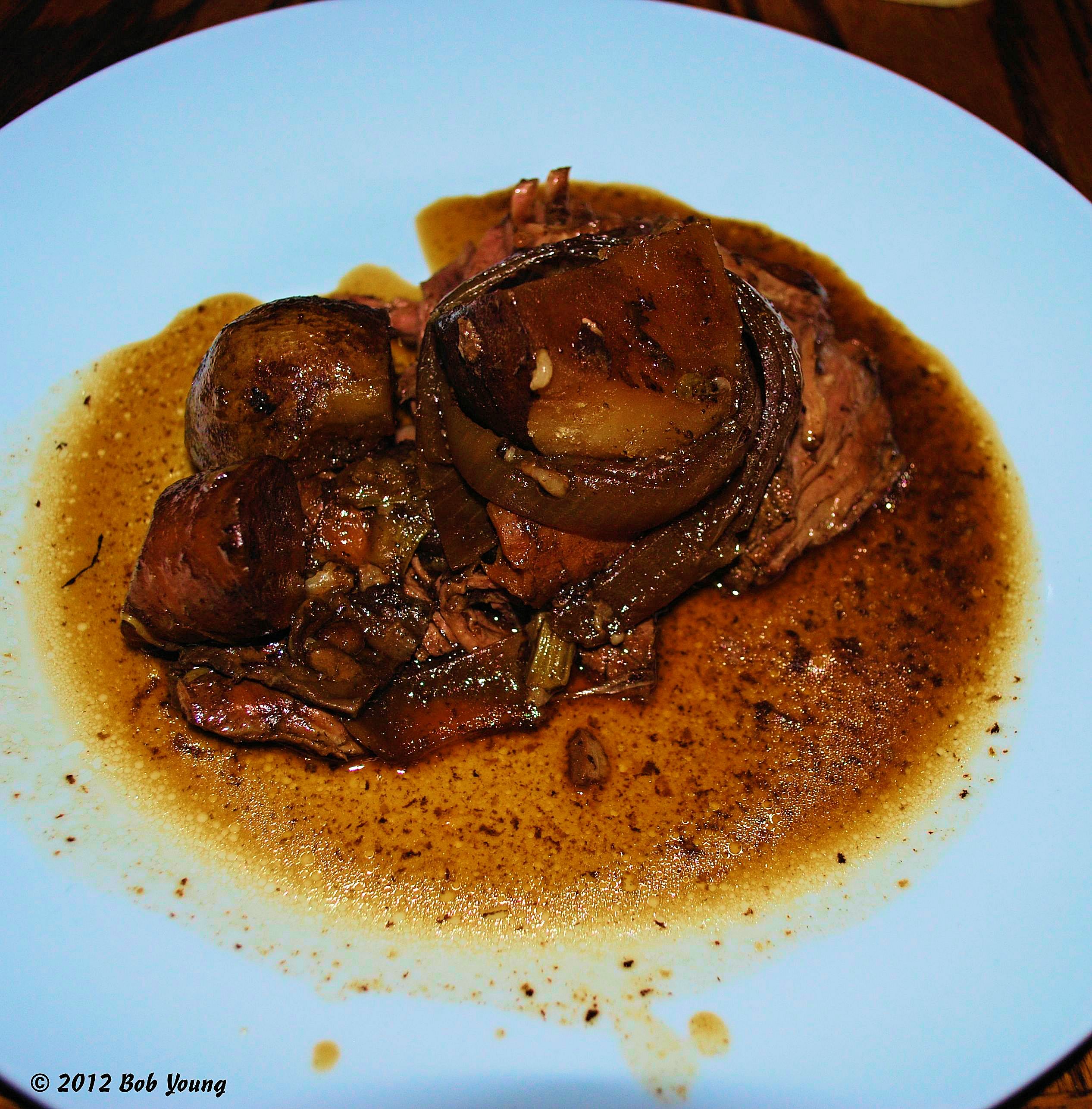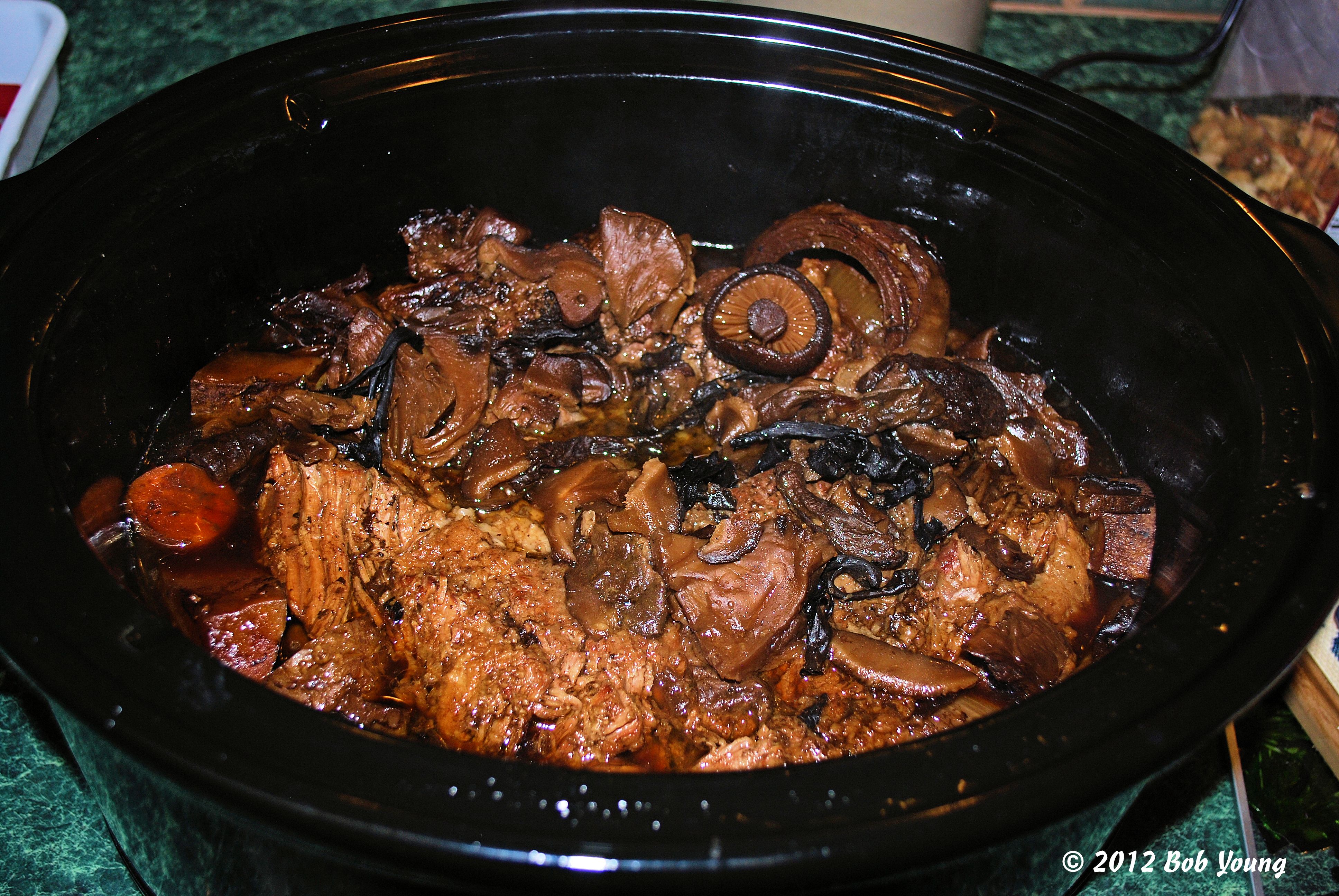 It turned into Fall. So did the temperatures – 61 degrees F right now and a light rain. Very light. All four drops! But what good weather for a Pot Roast. And what good timing for us to purchase a Crockpot. It’s been a while. I put the roast in at midnight and we ate at noon. Here is the Pot Roast still in the cooker about ready to be put on the table. Add a good glass of 2008 Stumbling Block Red Oregon Table Wine and we have a good dinner. Enjoy the photos.