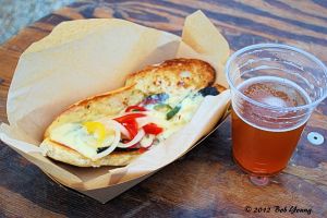 This is a Boise Cheese Steak from Saint Lawrence Gridiron, the red food truck in the opening photo. Different. Not a Philly cheese steak by any stretch of the imagination. “Where’s the beef?”, to coin a phrase. And I have no clue as to what that sauce was. The beer is a Payette Brewery IPA. Very good.