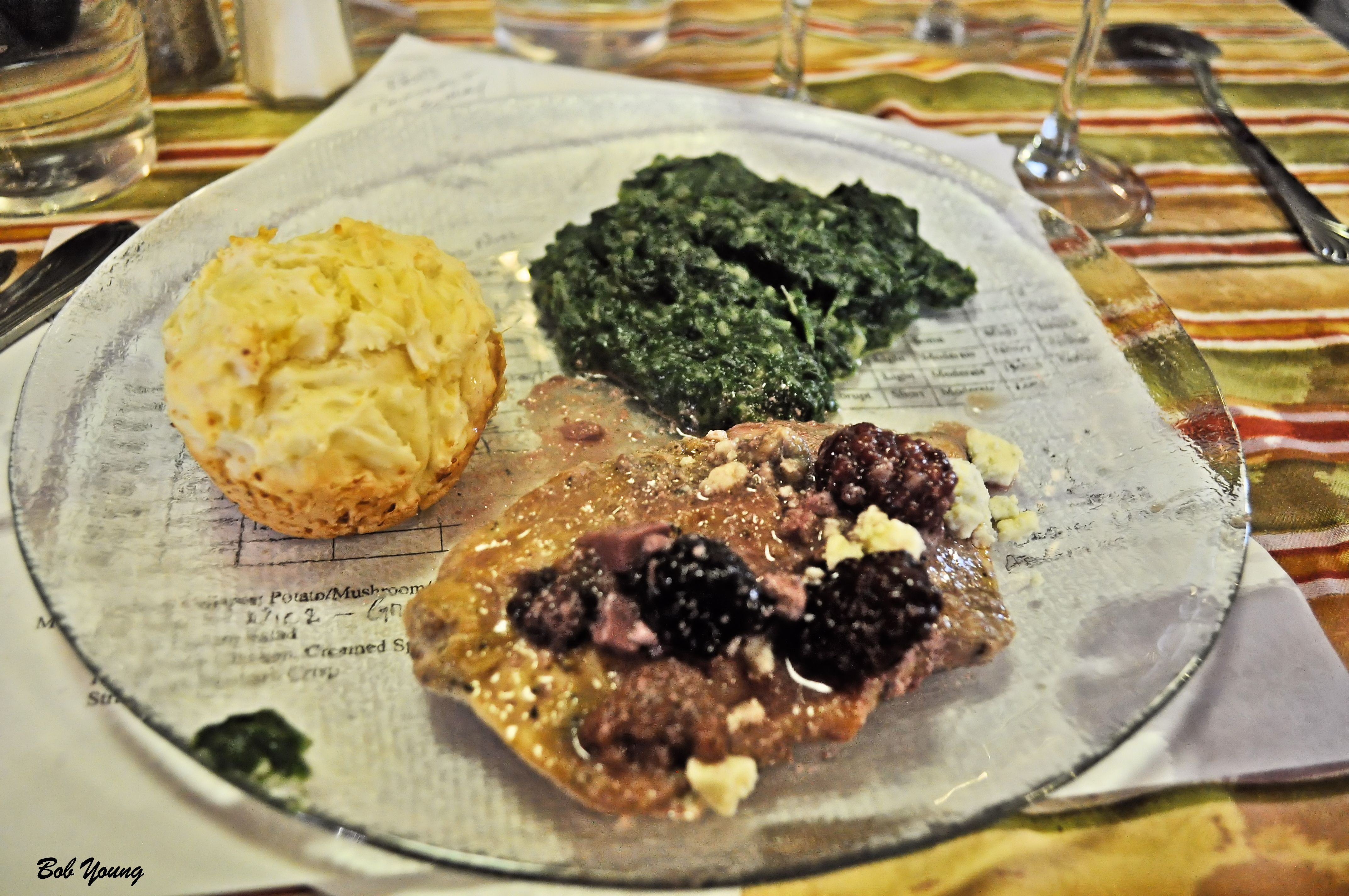 Huckleberry Chicken Creamed Spinach Biscuits 2010 Willamette Whole Cluster Pinot Noir 13.5% alc. sand and clay on the nose. not a big Pinot as some are. it did pair with the chicken and especially the spinach. [17] $2.00