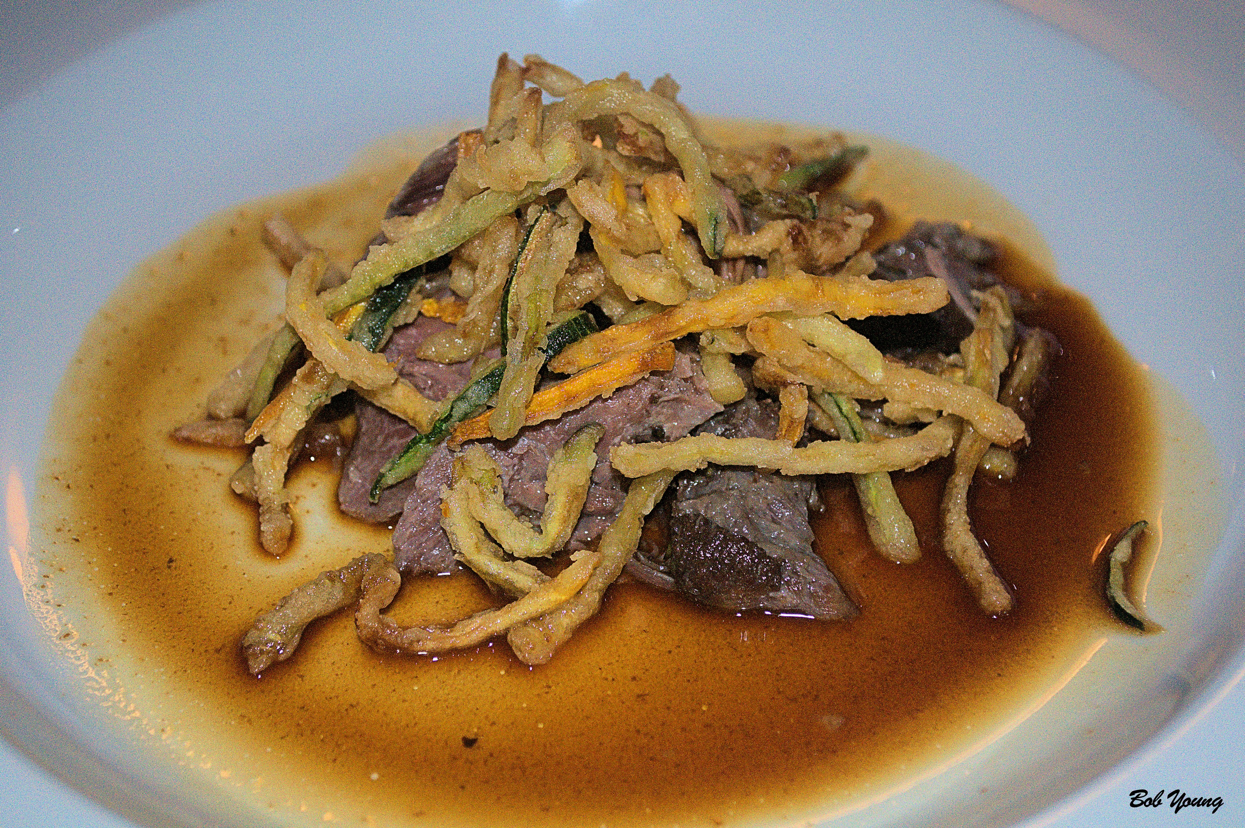 Cinghiale Arrosto Con Rosmarino e Ginepro wild boar with rosemary and juniper, currant sauce, zucchini. Great pairing with the Montalcino wine.
