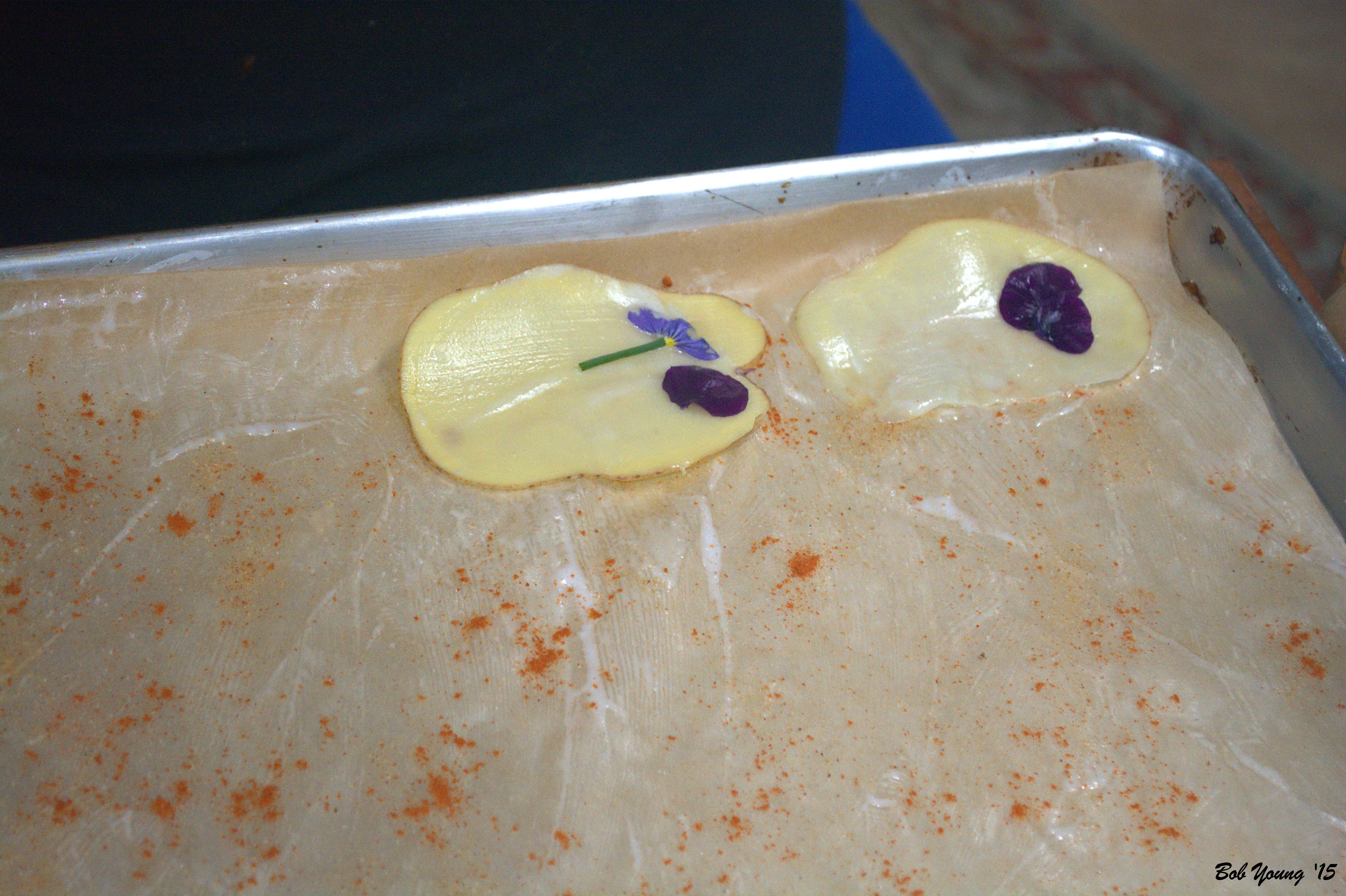 Slice a potato thin enough to be transparent. Lay on the buttered parchment and place the herbs and flowers. Butter the herbs/flowers.