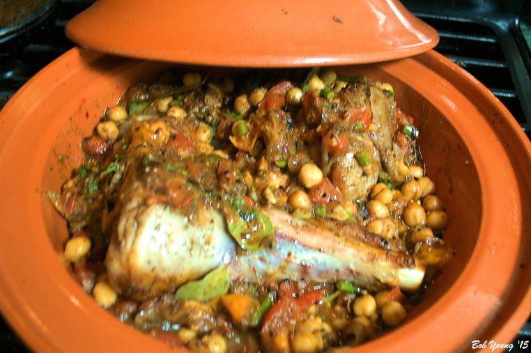 Add the vegetable mixture to the tagine. Taste and adjust as necessary. Place the lamb shanks into the vegetables. After 1 hour, it should look like this.