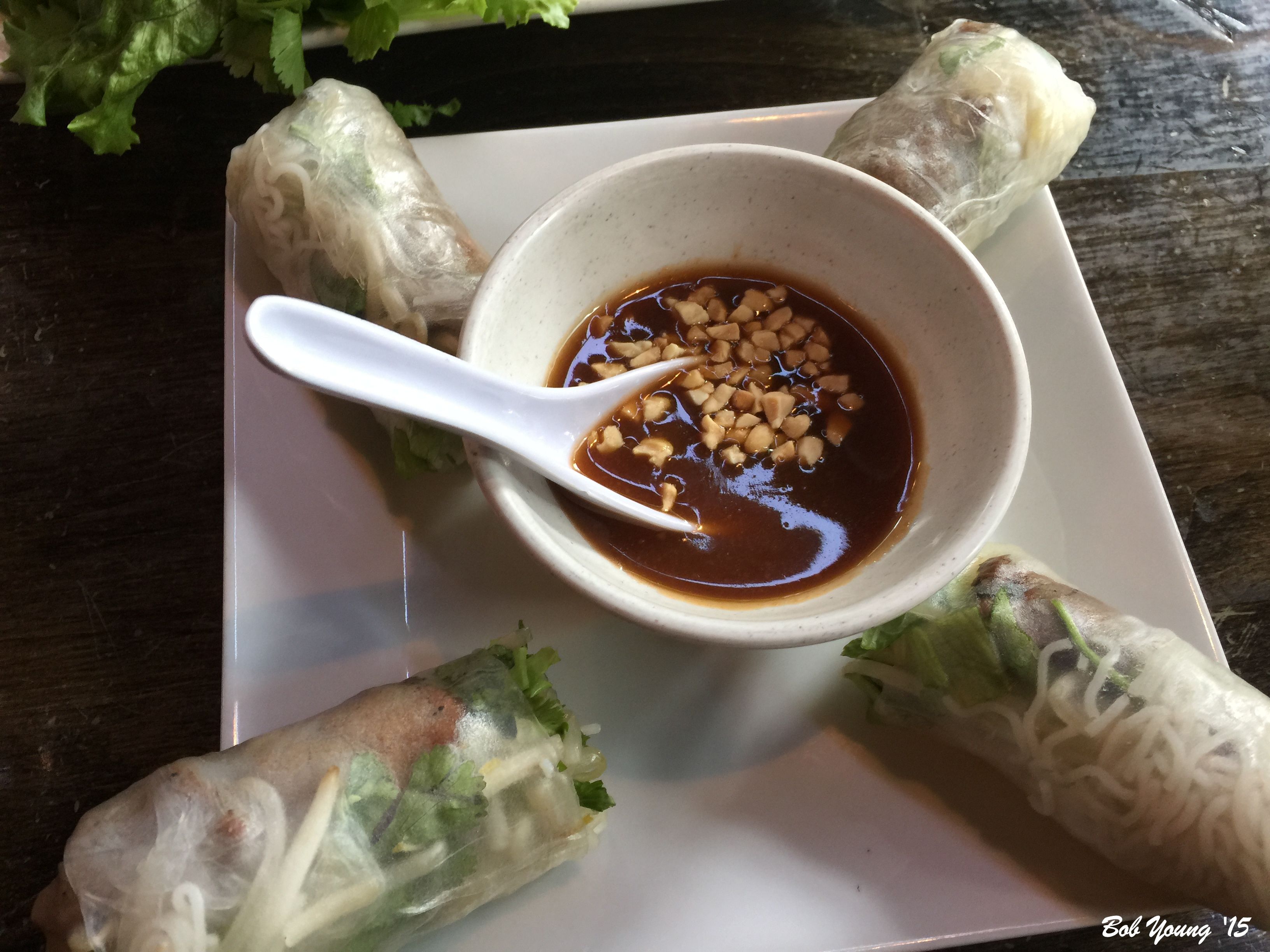 Fresh Summer Roll Soft rice paper wrapped with your choice of pork and shrimp, grilled salmon, grilled pork or shrimp, onion and bean sprouts. Wrap in a lettuce leaf, bean sprouts and herbs.