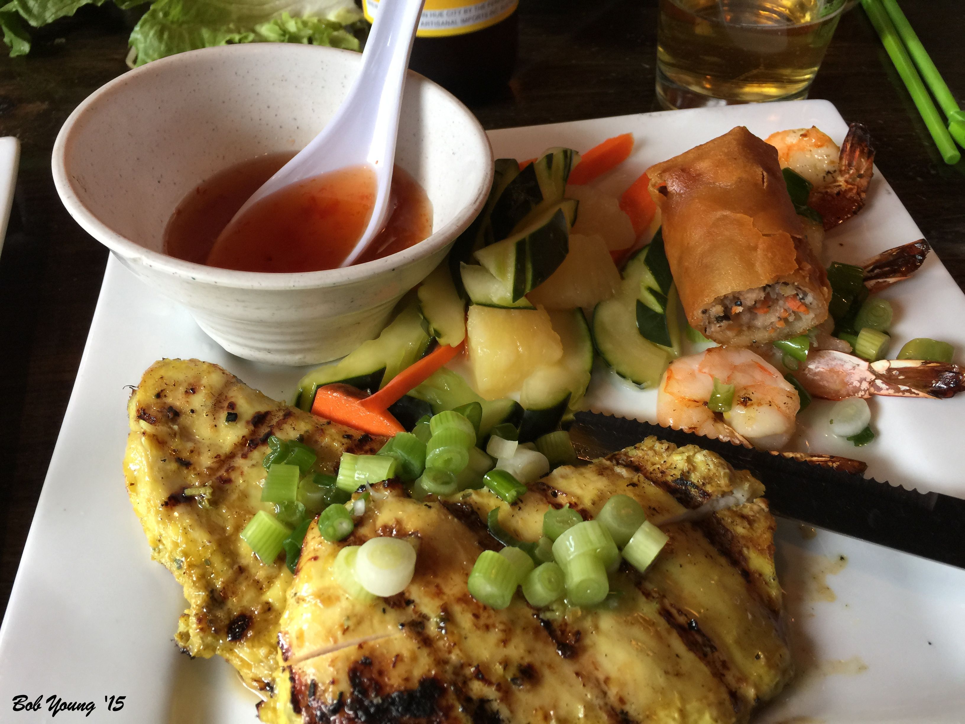 Grilled Chicken and Shripm Boneless chicken breasts and shrimps marinated in lemongrass, white wine and hoisin sauce. Served with steamed jasmine rice and cucumber salad.