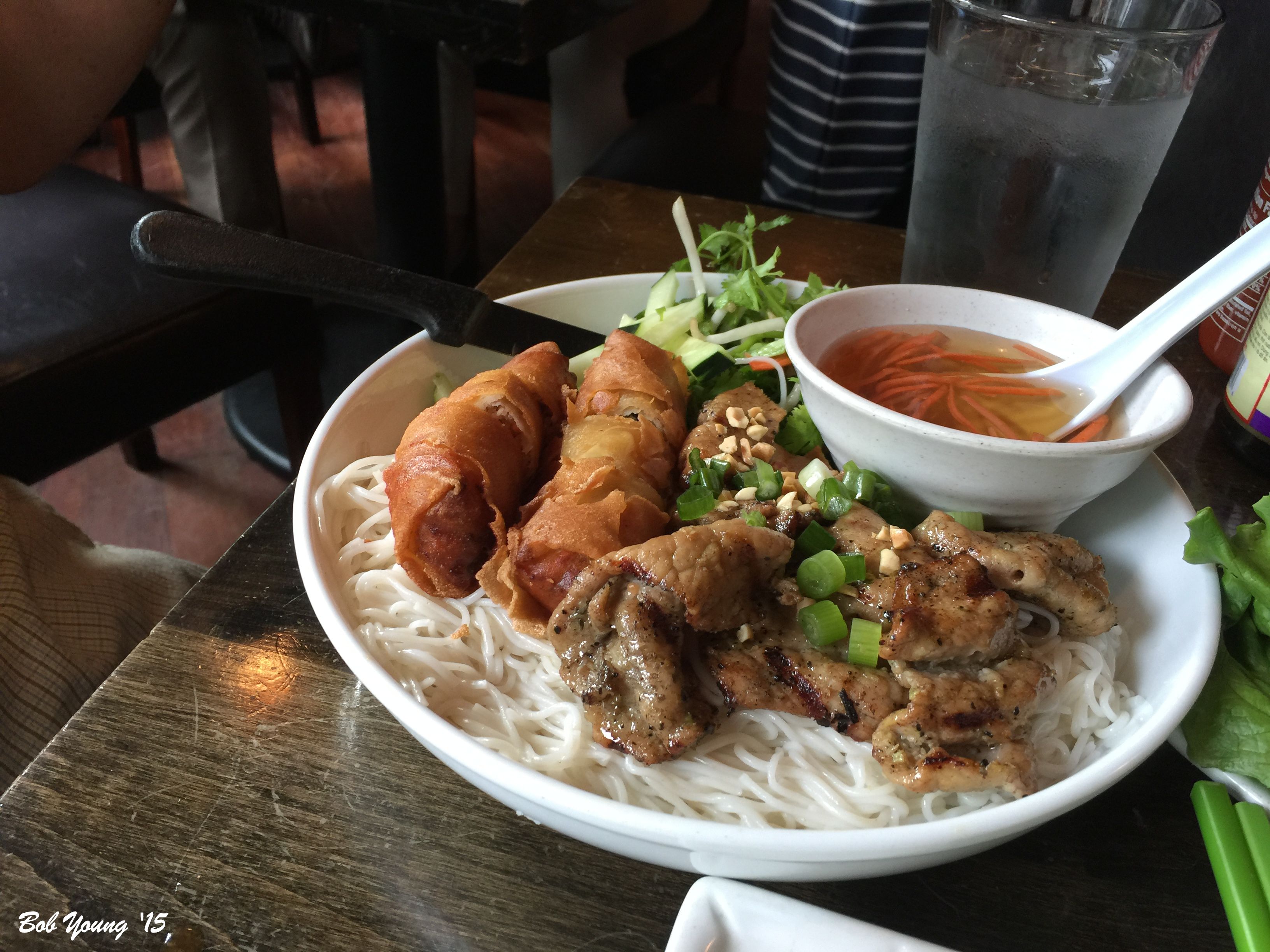 Grilled Pork and Crispy Spring Roll on Rice Noodles Spft rice vermicelli noodles, skewered grilled pork and crispy spring rolls. Served with shredded lettuce, beansprouts and cilantro. A sweet/sour dipping sauce is served with it.