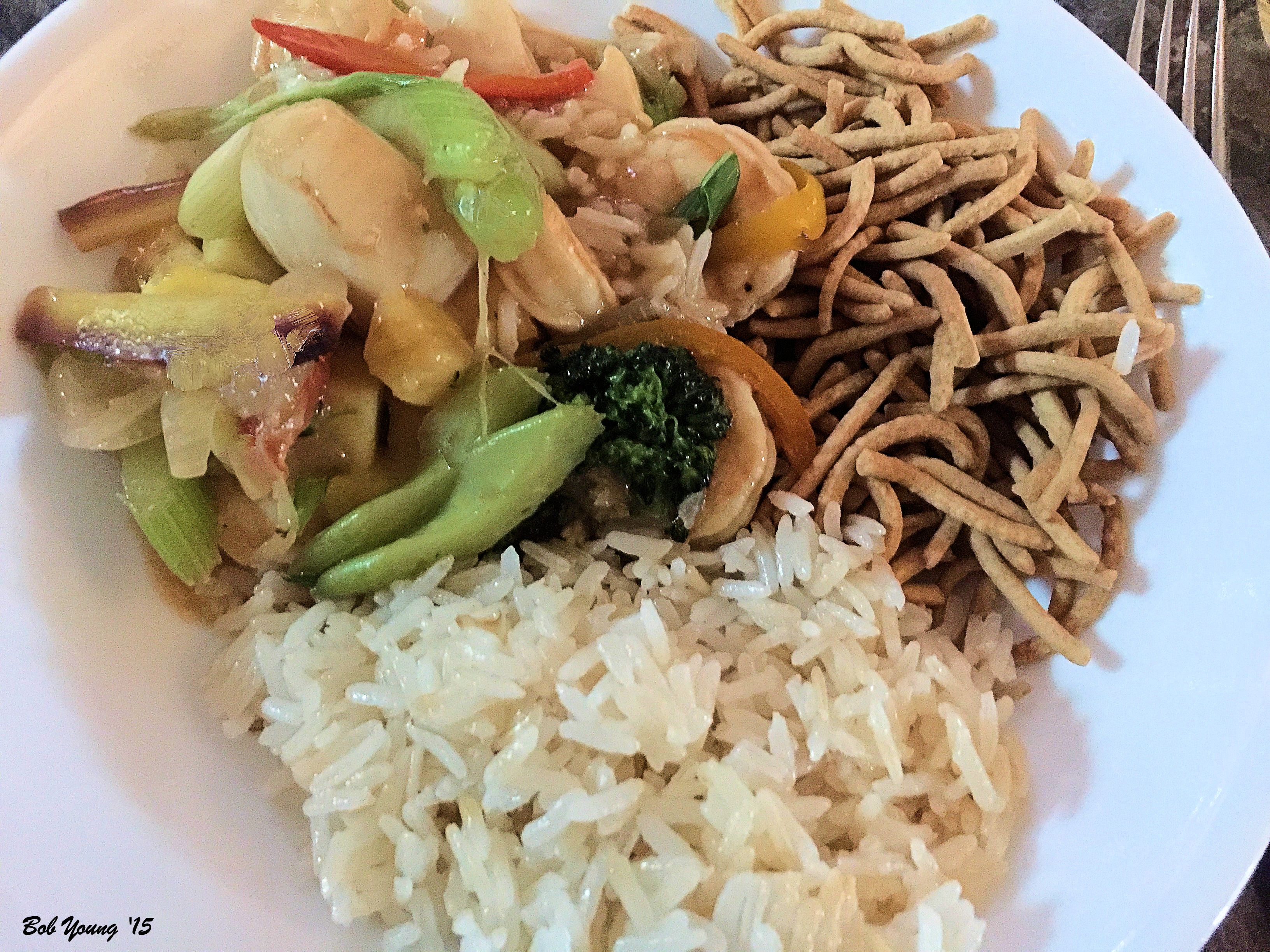 Shrimp, Scallop and Pineapple Stir Fry Coconut Rice and Chow Mein Noodles