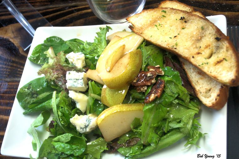 Parma Ridge House Salad Mixed greens with apple cider vinaigrette, Bleu cheese and poached pear with grilled bread